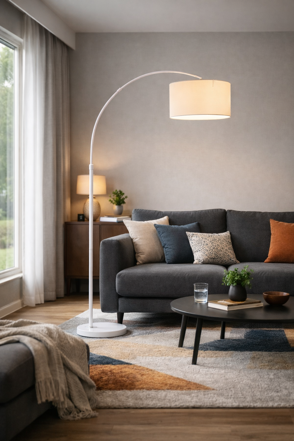 Elegantna bela Moderna podna lampa ARETA sa lučnim stalkom. Koristi standardno E27 grlo i idealna je za kreiranje prijatne atmosfere. Izrađena od izdržljivih materijala vrhunske završne obrade.